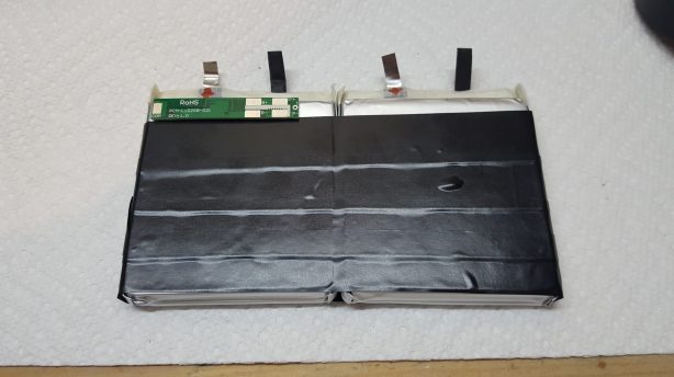 Using electrical tape, secure the two cells together as shown, making sure you don’t cover the protection circuit.