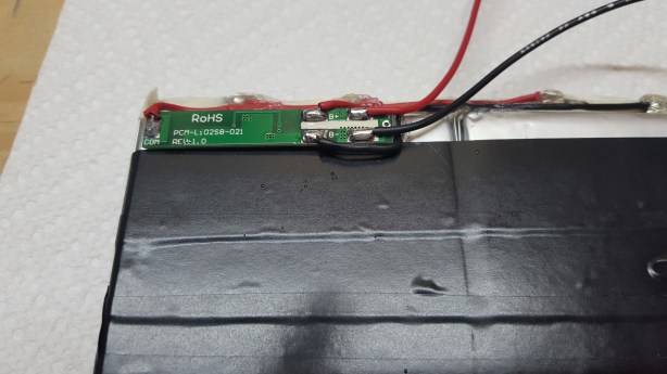 Lay the two cells side by side and secure the protection circuit to the left cell as shown with a bit of hot glue.