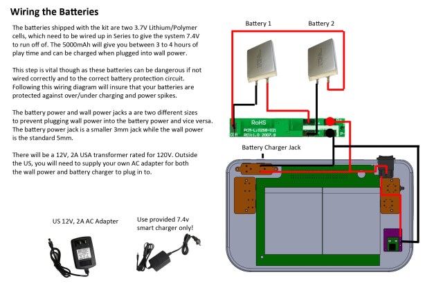 ***NOTE: Once the batteries have been wired to the protection circuit, by default, the protection circuit is going to cut the output, which if you don’t know ahead of time will lead to hours of trouble shooting trying to figure out why you can’t get any power to the system. The protection circuit will continue to keep the power cut until the 7.4v smart charger is connected which closes the circuit to the batteries and then allows power to flow, at which point you should be reading anywhere from 7.4 to 8.4V on a full battery charge.